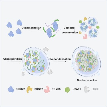 Summary: Nuclear speckles (NSs) are nuclear biomolecular condensates that are postulated to form by macromolecular phase separation, although the detailed underlying forces driving NS formation remain elusive. SRRM2 and SON are 2 non-redundant scaffold proteins for NSs. How each individual protein governs assembly of the NS protein network and the functional relationship between SRRM2 and SON are largely unknown. Here, we uncover immiscible multiphases of SRRM2 and SON within NSs. SRRM2 and SON are functionally independent, specifically regulating alternative splicing of subsets of mRNA targets, respectively. We further show that SRRM2 forms multicomponent liquid phases in cells to drive NS subcompartmentalization, which is reliant on homotypic interaction and heterotypic non-selective protein-RNA complex coacervation-driven phase separation. SRRM2 serine/arginine-rich (RS) domains form higher-order oligomers and can be replaced by oligomerizable synthetic modules. The serine residues within the RS domains, however, play an irreplaceable role in fine-tuning the liquidity of NSs.