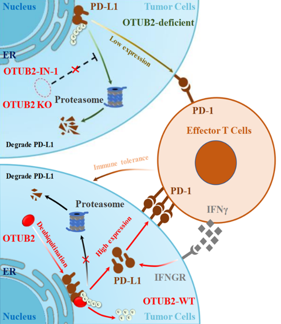 Abstract: PD-1 is a co-inhibitory receptor expressed by CD8+ T cells which limits their cytotoxicity. PD-L1 expression on cancer cells contributes to immune evasion by cancers, thus, understanding the mechanisms that regulate PD-L1 protein levels in cancers is important. Here we identify tumor-cell-expressed otubain-2 (OTUB2) as a negative regulator of antitumor immunity, acting through the PD-1/PD-L1 axis in various human cancers. Mechanistically, OTUB2 directly interacts with PD-L1 to disrupt the ubiquitination and degradation of PD-L1 in the endoplasmic reticulum. Genetic deletion of OTUB2 markedly decreases the expression of PD-L1 proteins on the tumor cell surface, resulting in increased tumor cell sensitivity to CD8+ T-cell-mediated cytotoxicity. To underscore relevance in human patients, we observe a significant correlation between OTUB2 expression and PD-L1 abundance in human non-small cell lung cancer. An inhibitor of OTUB2, interfering with its deubiquitinase activity without disrupting the OTUB2-PD-L1 interaction, successfully reduces PD-L1 expression in tumor cells and suppressed tumor growth. Together, these results reveal the roles of OTUB2 in PD-L1 regulation and tumor evasion and lays down the proof of principle for OTUB2 targeting as therapeutic strategy for cancer treatment.
