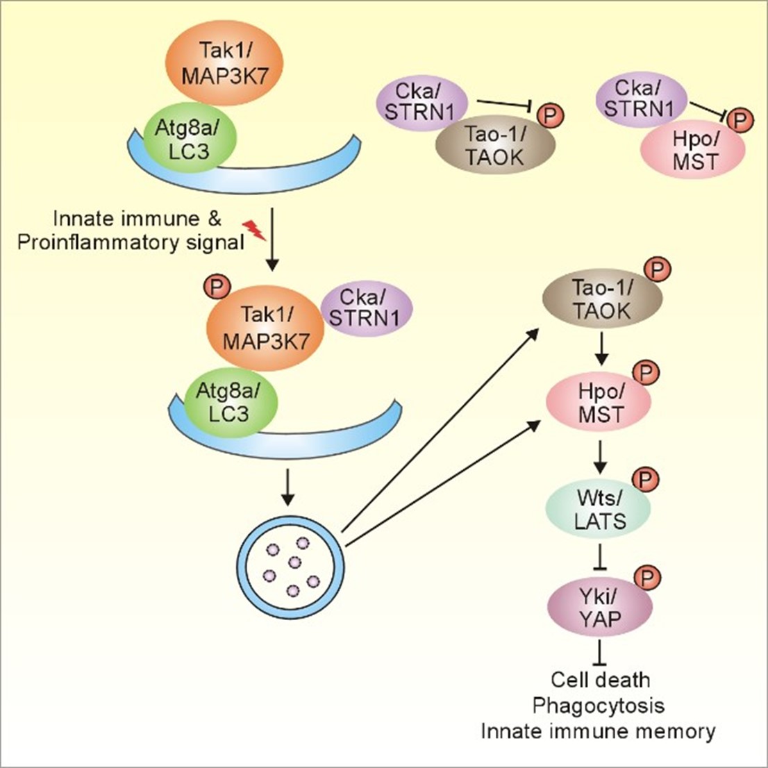 Abstract: The Hippo pathway controls developmental, homeostatic and regenerative tissue growth, and is frequently dysregulated in various diseases. Although this pathway can be activated by innate immune/inflammatory stimuli, the underlying mechanism is not fully understood. Here, we identify a conserved signaling cascade that leads to Hippo pathway activation by innate immune/inflammatory signals. We show that Tak1, a key kinase in innate immune/inflammatory signaling, activates the Hippo pathway by inducing the lysosomal degradation of Cka, an essential subunit of the STRIPAK PP2A complex that suppresses Hippo signaling. Suppression of STRIPAK results in the activation of Hippo pathway through Tao-Hpo signaling. We further show that Tak1-mediated Hippo signaling is involved in processes ranging from cell death to phagocytosis and innate immune memory. Our findings thus reveal a molecular connection between innate immune/inflammatory signaling and the evolutionally conserved Hippo pathway, thus contributing to our understanding of infectious, inflammatory and malignant diseases.