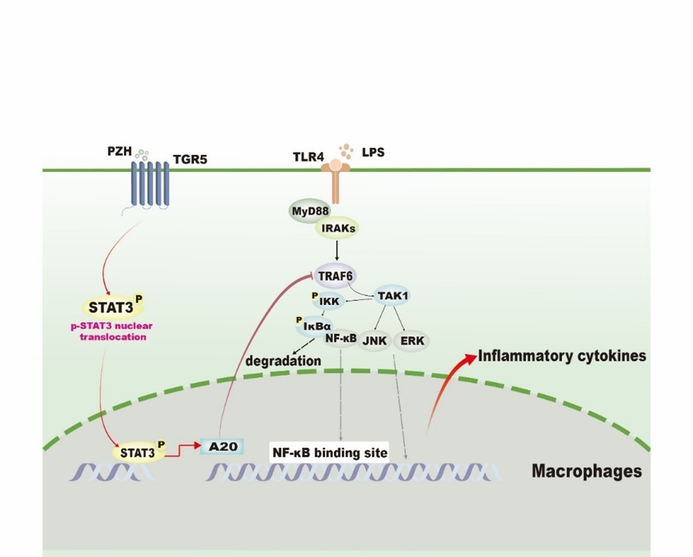 Abstract: Pien Tze Huang (PZH), a class-1 nationally protected traditional Chinese medicine (TCM), has been used to treat liver diseases such as hepatitis; however, the effect of PZH on the progression of sepsis is unknown. Here, we reported that PZH attenuated lipopolysaccharide (LPS)-induced sepsis in mice and reduced LPS-induced production of proinflammatory cytokines in macrophages by inhibiting the activation of mitogen-activated protein kinase (MAPK) and nuclear factor-kappa B (NF-κB) signalling. Mechanistically, PZH stimulated signal transducer and activator of transcription 3 (STAT3) phosphorylation to induce the expression of A20, which could inhibit the activation of NF-κB and MAPK signalling. Knockdown of the bile acid (BA) receptor G protein-coupled bile acid receptor 1 (TGR5) in macrophages abolished the effects of PZH on STAT3 phosphorylation and A20 induction, as well as the LPS-induced inflammatory response, suggesting that BAs in PZH may mediate its anti-inflammatory effects by activating TGR5. Consistently, deprivation of BAs in PZH by cholestyramine resin reduced the effects of PZH on the expression of phosphorylated-STAT3 and A20, the activation of NF-κB and MAPK signalling, and the production of proinflammatory cytokines, whereas the addition of BAs to cholestyramine resin-treated PZH partially restored the inhibitory effects on the production of proinflammatory cytokines. Overall, our study identifies BAs as the effective components in PZH that activate TGR5-STAT3-A20 signalling to ameliorate LPS-induced sepsis.