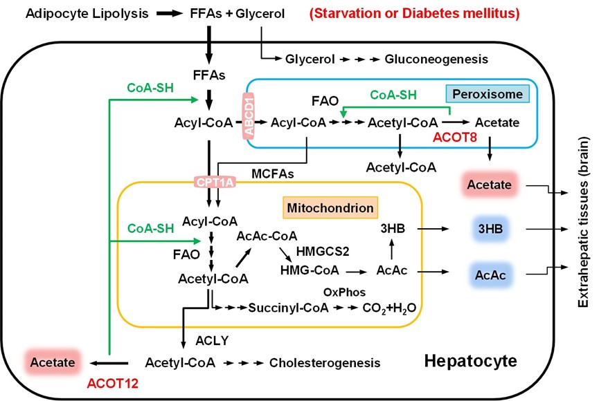 Abstract: Accumulating evidence indicates that acetate is increased under energy stress conditions such as those that occur in diabetes mellitus and prolonged starvation. However, how and where acetate is produced and the nature of its biological significance are largely unknown. We observed overproduction of acetate to concentrations comparable to those of ketone bodies in patients and mice with diabetes or starvation. Mechanistically, ACOT12 and ACOT8 are dramatically upregulated in the liver to convert free fatty acid-derived acetyl-CoA to acetate and CoA. This conversion not only provides a large amount of acetate, which preferentially fuels the brain rather than muscle, but also recycles CoA, which is required for sustained fatty acid oxidation and ketogenesis. We suggest that acetate is an emerging novel ‘ketone body’ that may be used as a parameter to evaluate the progression of energy stress.
