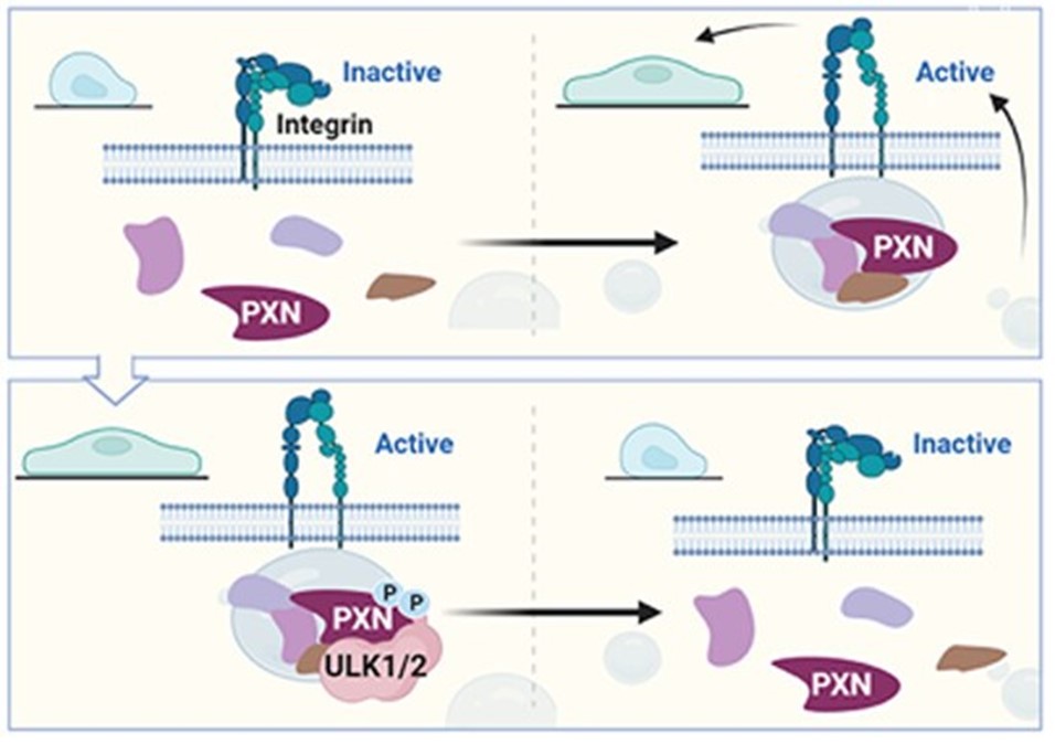 Abstract: The remodeling and stiffening of the extracellular matrix (ECM) is a well‐recognized modulator of breast cancer progression. How changes in the mechanical properties of the ECM are converted into biochemical signals that direct tumor cell migration and metastasis remain poorly characterized. Here, we describe a new role for the autophagy‐inducing serine/threonine kinases ULK1 and ULK2 in mechanotransduction. We show that ULK1/2 activity inhibits the assembly of actin stress fibers and focal adhesions (FAs) and as a consequence impedes cell contraction and migration, independent of its role in autophagy. Mechanistically, we identify PXN/paxillin, a key component of the mechanotransducing machinery, as a direct binding partner and substrate of ULK1/2. ULK‐mediated phosphorylation of PXN at S32 and S119 weakens homotypic interactions and liquid–liquid phase separation of PXN, impairing FA assembly, which in turn alters the mechanical properties of breast cancer cells and their response to mechanical stimuli. ULK1/2 and the well‐characterized PXN regulator, FAK/Src, have opposing functions on mechanotransduction and compete for phosphorylation of adjacent serine and tyrosine residues. Taken together, our study reveals ULK1/2 as important regulator of PXN‐dependent mechanotransduction.