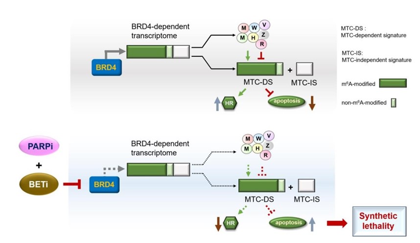 Abstract: Aberrant transcripts expression of the m6A methyltransferase complex (MTC) is widely found across human cancers, suggesting a dysregulated signaling cascade which integrates m6A epitranscriptome to drive tumorigenesis. However, the responsible transcriptional machinery directing the expression of distinct MTC subunits remains unclear. Here, we identified an unappreciated interplay between the histone acetyl-lysine reader BRD4 and the m6A writer complex across human cancers. BRD4 directly stimulates transcripts expression of seven MTC subunits, allowing the maintenance of the nuclear writer complex integrity. Upon BET inhibition, this BRD4-MTC signaling cascade accounts for global m6A reduction and the subsequent dynamic alteration of BRD4-dependent transcriptome, resulting in impaired DNA damage response that involves activation of homologous recombination (HR) repair and repression of apoptosis. We further demonstrated that the combined synergy upon BET/PARP inhibition largely relies on disrupted m6A modification of HR and apoptotic genes, counteracting PARP inhibitor (PARPi) resistance in patient-derived xenograft models. Our study revealed a widespread active cross-talk between BRD4-dependent epigenetic and MTC-mediated epitranscriptomic networks, which provides a unique therapeutic vulnerability that can be leveraged in combined DNA repair-targeted therapy.