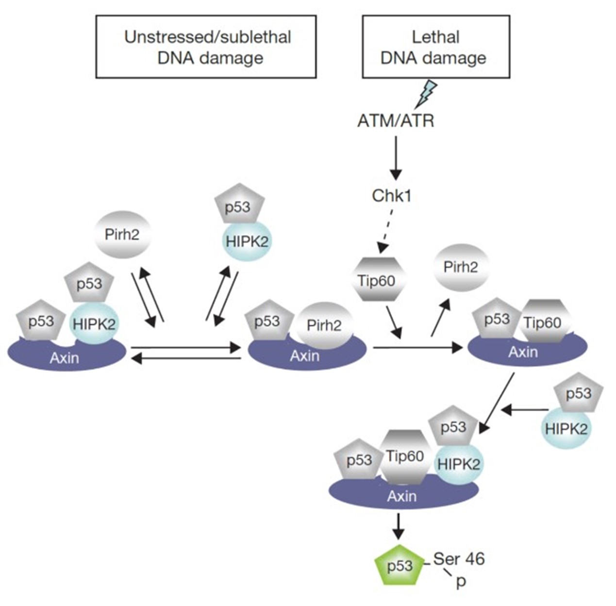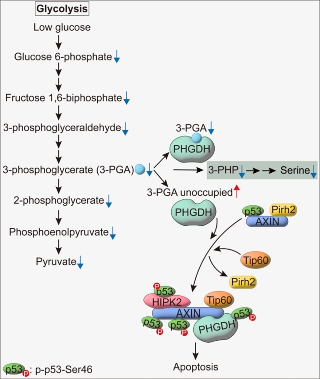 Abstract: Glycolytic intermediary metabolites such as fructose-1,6-bisphosphate can serve as signals, controlling metabolic states beyond energy metabolism. However, whether glycolytic metabolites also play a role in controlling cell fate remains unexplored. Here, we find that low levels of glycolytic metabolite 3-phosphoglycerate (3-PGA) can switch phosphoglycerate dehydrogenase (PHGDH) from cataplerosis serine synthesis to pro-apoptotic activation of p53. PHGDH is a p53-binding protein, and when unoccupied by 3-PGA interacts with the scaffold protein AXIN in complex with the kinase HIPK2, both of which are also p53-binding proteins. This leads to the formation of a multivalent p53-binding complex that allows HIPK2 to specifically phosphorylate p53-Ser46 and thereby promote apoptosis. Furthermore, we show that PHGDH mutants (R135W and V261M) that are constitutively bound to 3-PGA abolish p53 activation even under low glucose conditions, while the mutants (T57A and T78A) unable to bind 3-PGA cause constitutive p53 activation and apoptosis in hepatocellular carcinoma (HCC) cells, even in the presence of high glucose. In vivo, PHGDH-T57A induces apoptosis and inhibits the growth of diethylnitrosamine-induced mouse HCC, whereas PHGDH-R135W prevents apoptosis and promotes HCC growth, and knockout of Trp53 abolishes these effects above. Importantly, caloric restriction that lowers whole-body glucose levels can impede HCC growth dependent on PHGDH. Together, these results unveil a mechanism by which glucose availability autonomously controls p53 activity, providing a new paradigm of cell fate control by metabolic substrate availability.