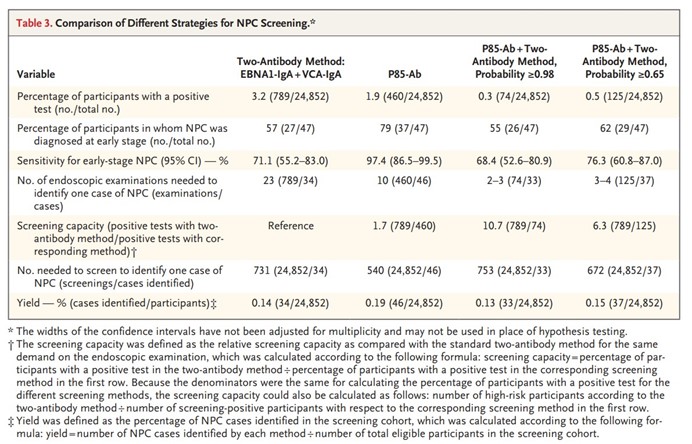 Our results suggest that P85-Ab is a promising novel biomarker for nasopharyngeal carcinoma screening, with higher sensitivity, specificity, and positive predictive value than the standard two-antibody method. (Funded by the National Key Research and Development Program of China and others; ClinicalTrials.gov number, NCT04085900.)