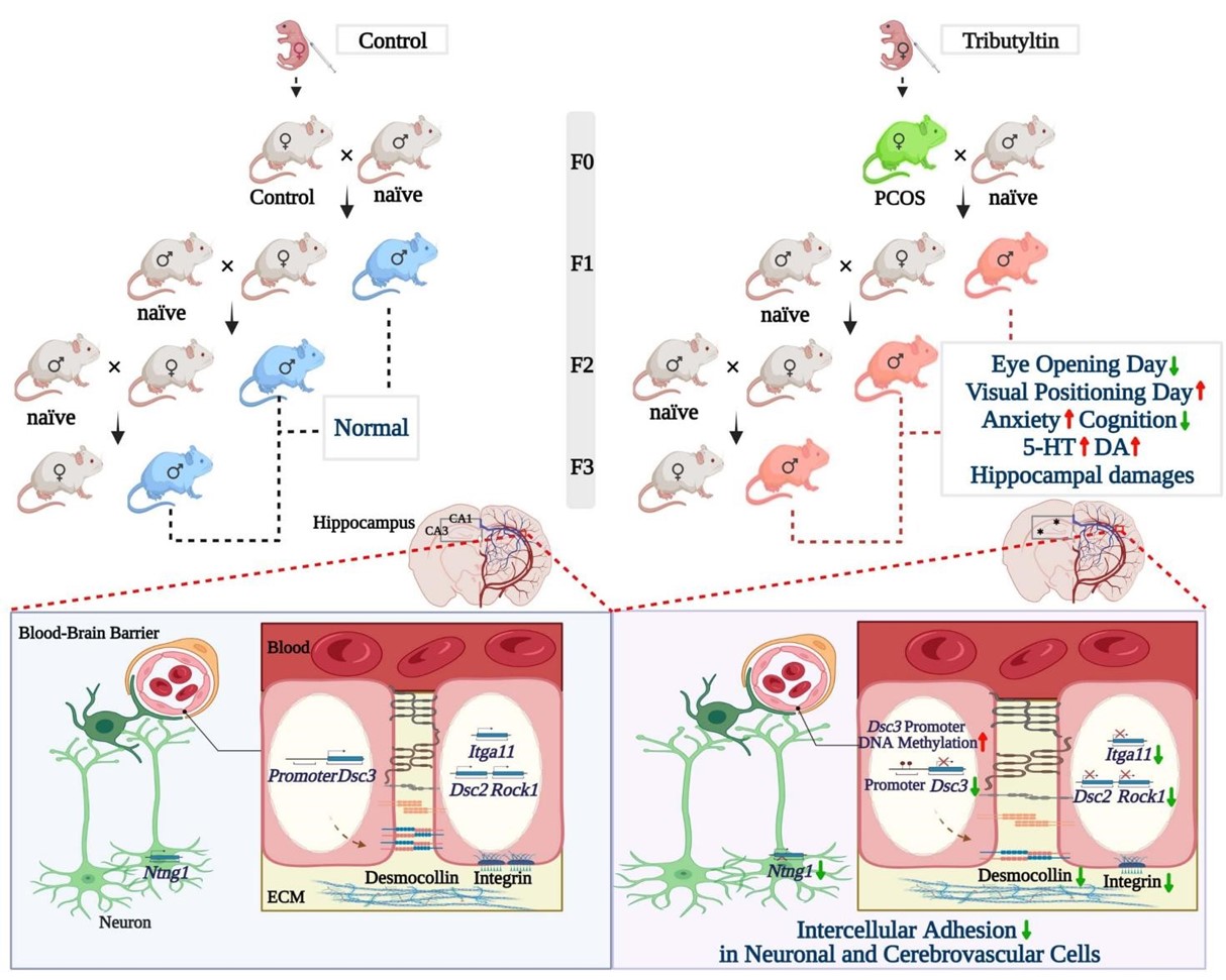 Abstract: This study aimed to investigate the transgenerational effects of tributyltin exposure on rat neurodevelopment in male offspring and the potential mechanisms. Neonatal female rats were exposed to the environmental level of tributyltin and then mated with nonexposed males after sexual maturity to produce the F1 generation. The F1 generation (with primordial germ cell exposure) was mated with nonexposed males to produce nonexposed offspring (the F2 and F3 generations). Neurodevelopmental indicators and behavior were observed for the F1, F2, and F3 generations during postnatal days 1–25 and 35–56, respectively. We found premature eye-opening and delayed visual positioning in newborn F1 rats and anxiety and cognitive deficits in prepubertal F1 male rats. These neurodevelopmental impacts were also observed in F2 and F3 males. Additionally, F1–F3 males exhibited increased serotonin and dopamine levels and a loose arrangement of neurons in the hippocampus. We also observed a reduction in the expression of genes involved in intercellular adhesion and increased DNA methylation of the Dsc3 promoter in F1–F3 males. We concluded that tributyltin exposure led to transgenerational effects on neurodevelopment via epigenetic reprogramming in male offspring. These findings provide insights into the risks of neurodevelopmental disorders in offspring from parents exposed to tributyltin.