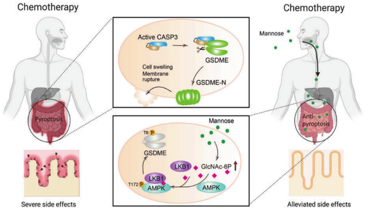Abstract: Pyroptosis is a type of regulated cell death executed by gasdermin family members. However, how gasdermin-mediated pyroptosis is negatively regulated remains unclear. Here, we demonstrate that mannose, a hexose, inhibits GSDME-mediated pyroptosis by activating AMP-activated protein kinase (AMPK). Mechanistically, mannose metabolism in the hexosamine biosynthetic pathway increases levels of the metabolite N-acetylglucosamine-6-phosphate (GlcNAc-6P), which binds AMPK to facilitate AMPK phosphorylation by LKB1. Activated AMPK then phosphorylates GSDME at Thr6, which leads to blockade of caspase-3-induced GSDME cleavage, thereby repressing pyroptosis. The regulatory role of AMPK-mediated GSDME phosphorylation was further confirmed in AMPK knockout and GSDMET6E or GSDMET6A knock-in mice. In mouse primary cancer models, mannose administration suppressed pyroptosis in small intestine and kidney to alleviate cisplatin- or oxaliplatin-induced tissue toxicity without impairing antitumor effects. The protective effect of mannose was also verified in a small group of patients with gastrointestinal cancer who received normal chemotherapy. Our study reveals a novel mechanism whereby mannose antagonizes GSDME-mediated pyroptosis through GlcNAc-6P-mediated activation of AMPK, and suggests the utility of mannose supplementation in alleviating chemotherapy-induced side effects in clinic applications.