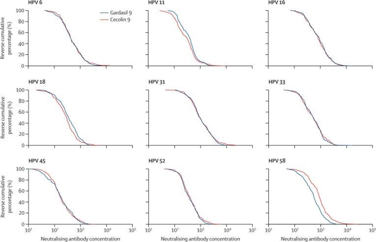 Interpretation: Cecolin 9 induced non-inferior HPV type-specific immune responses compared with Gardasil 9 and is a potential candidate to accelerate the elimination of cervical cancer by allowing for global accessibility to 9-valent HPV vaccinations, especially in low-income and middle-income countries.