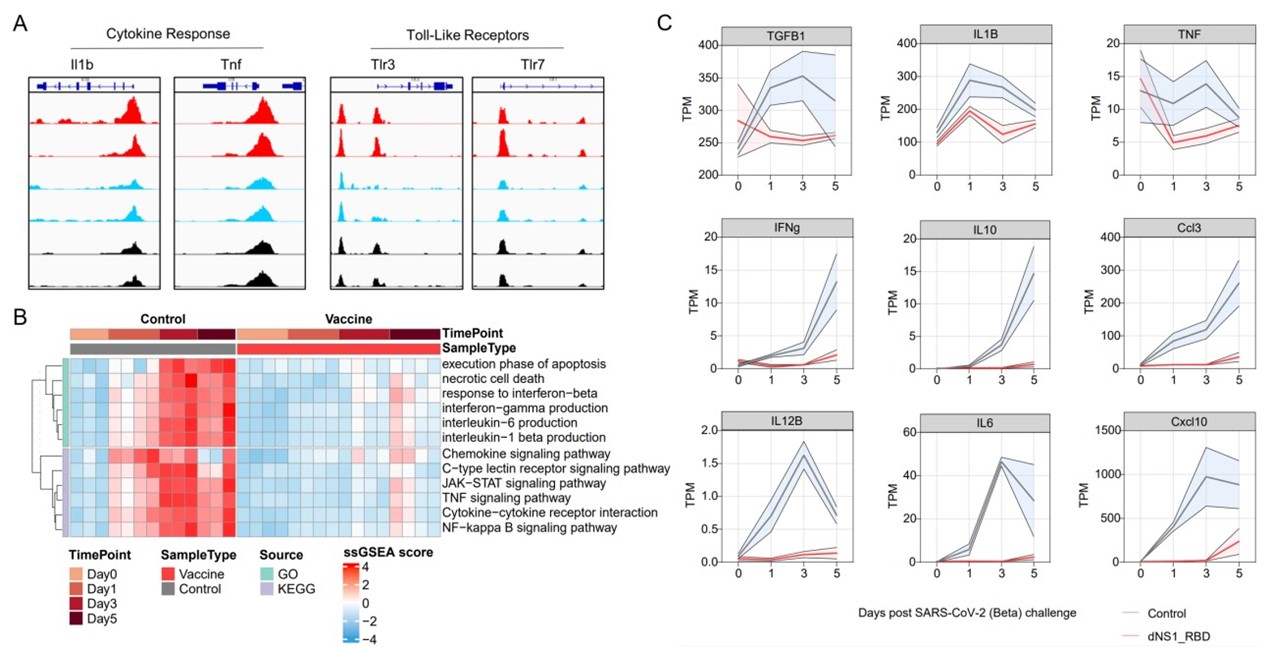 Abstract: The emergence of severe acute respiratory syndrome coronavirus-2 (SARS-CoV-2) variants and “anatomical escape” characteristics threaten the effectiveness of current coronavirus disease 2019 (COVID-19) vaccines. There is an urgent need to understand the immunological mechanism of broad-spectrum respiratory tract protection to guide broader vaccines development. Here we investigate immune responses induced by an NS1-deleted influenza virus vectored intranasal COVID-19 vaccine (dNS1-RBD) which provides broad-spectrum protection against SARS-CoV-2 variants in hamsters. Intranasal delivery of dNS1-RBD induces innate immunity, trained immunity and tissue-resident memory T cells covering the upper and lower respiratory tract. It restrains the inflammatory response by suppressing early phase viral load post SARS-CoV-2 challenge and attenuating pro-inflammatory cytokine (Il6, Il1b, and Ifng) levels, thereby reducing excess immune-induced tissue injury compared with the control group. By inducing local cellular immunity and trained immunity, intranasal delivery of NS1-deleted influenza virus vectored vaccine represents a broad-spectrum COVID-19 vaccine strategy to reduce disease burden.