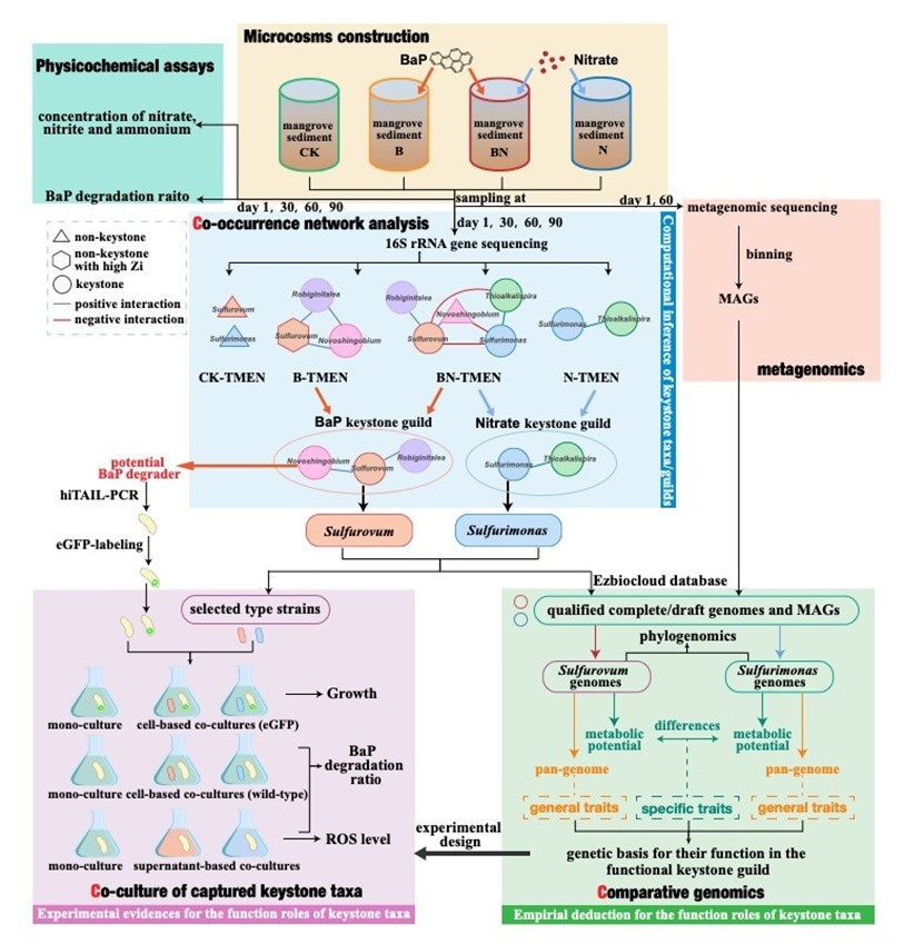 Keystone taxa are drivers of microbiome structure and functioning, which may play critical roles in microbiome-level responses to recalcitrant pollution and are a key to bioremediation. However, the characterization and manipulation of such taxa is a major challenge due to the complexity of microbial communities and rapid turnover in both time and space. Here, microcosms were set up with benzo[a]-pyrene (BaP) and/or nitrate based on C-rich, S-rich, and N-limited mangrove sediments as reductive experimental models to trigger and track the turnover of keystone taxa to address this challenge.
