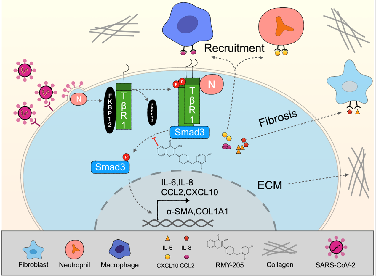 Abstract: Pulmonary fibrosis is a typical sequela of coronavirus disease 2019 (COVID-19), which is linked with a poor prognosis for COVID-19 patients. However, the underlying mechanism of pulmonary fibrosis induced by severe acute respiratory syndrome coronavirus 2 (SARS-CoV-2) is unclear. Here, we demonstrated that the nucleocapsid (N) protein of SARS-CoV-2 induced pulmonary fibrosis by activating pulmonary fibroblasts. N protein interacted with the transforming growth factor β receptor I (TβRI), to disrupt the interaction of TβRI-FK506 Binding Protein12 (FKBP12), which led to activation of TβRI to phosphorylate Smad3 and boost expression of pro-fibrotic genes and secretion of cytokines to promote pulmonary fibrosis. Furthermore, we identified a compound, RMY-205, that bound to Smad3 to disrupt TβRI-induced Smad3 activation. The therapeutic potential of RMY-205 was strengthened in mouse models of N protein-induced pulmonary fibrosis. This study highlights a signaling pathway of pulmonary fibrosis induced by N protein and demonstrates a novel therapeutic strategy for treating pulmonary fibrosis by a compound targeting Smad3.