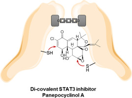 Abstract:Homo- or heterodimeric compounds that affect dimeric protein function through interaction between monomeric moieties and protein subunits can serve as valuable sources of potent and selective drug candidates. Here, we screened an in-house dimeric natural product collection, and panepocyclinol A (PecA) emerged as a selective and potent STAT3 inhibitor with profound anti-tumor efficacy. Through cross-linking C712/C718 residues in separate STAT3 monomers with two distinct Michael receptors, PecA inhibits STAT3 DNA binding affinity and transcription activity. Molecular dynamics simulation reveals the key conformation changes of STAT3 dimers upon the di-covalent binding with PecA that abolishes its DNA interactions. Furthermore, PecA exhibits high efficacy against anaplastic large T cell lymphoma in vitro and in vivo, especially those with constitutively activated STAT3 or STAT3Y640F. In summary, our study describes a distinct and effective di-covalent modification for the dimeric compound PecA to disrupt STAT3 function.