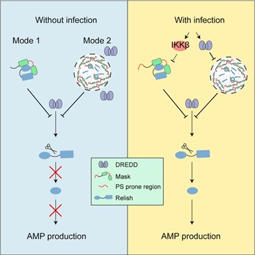 Abstract:Nuclear factor κB (NF-κB) family transcription factors are critical for innate immune responses across a variety of organisms and are frequently dysregulated in diseases. Understanding their homeostatic regulation is essential for developing therapeutic strategies. Relish, a Drosophila homolog of mammalian NF-κB precursors, provides a valuable model for studying these processes. Although the activation of Relish upon stimulus is well-understood, the mechanisms maintaining its inactivity in the resting state remain unclear. Here, we identify the ankyrin repeat protein multiple ankyrin repeats single KH domain (Mask) as an inhibitor of Relish. Mask binds directly to Relish, facilitating it in a closed conformation, and forms biomolecular condensates that spatially segregate Relish from death-related ced-3/Nedd2-like protein (DREDD), a caspase necessary for Relish activation. Upon immune stimulation, Mask dissociates from Relish and is cleaved by DREDD, thus relieving the inhibition. Notably, Mask's regulatory role is partially conserved in mammals. Our findings provide important insights into NF-κB regulation and highlight the significance of biomolecular condensates in immune control.