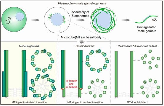 Abstract: Axoneme assembly constitutes a pivotal process in male gametogenesis of Plasmodium. Plasmodium possesses a unique nuclear envelope-anchored basal body that templates axoneme assembly, distinct from the basal body that templates the axoneme of cilia or flagella to protrude from the cell surface. In the canonical basal body, the microtubule (MT) triplet extends and forms the axonemal MT doublet. However, this characteristic MT triplet has not been detected in Plasmodium. Indeed, the MT organization and the mechanism underlying the axonemal MT doublet assembly remain elusive in Plasmodium. Here we utilize high-resolution imaging methods including iterative ultrastructure expansion microscopy (iU-ExM) and cryo-electron tomography (cryo-ET) to resolve the native MT organization in the basal body of male gametes from the rodent malaria parasite P. yoelii. The parasite exhibits an MT singlet-to-doublet transition, distinct from the canonical MT triplet-to-doublet transition. Furthermore, we reveal that δ-Tubulin and ε-Tubulin are expressed in male gametocytes and regulate axoneme formation during male gametogenesis. δ-Tubulin is localized at the proximal end of the MT B-tubule and modulates B-tubule assembly of MT doublet. Our work provides the native architecture of MT singlet-to-doublet transition and reveals the key role of δ-Tubulin and ε-Tubulin in MT singlet-to-doublet transition in the basal body of Plasmodium.