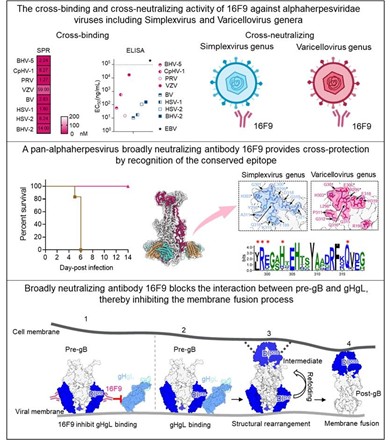 Abstract: The global prevalence and disease burden of alphaherpesviruses infections, including human-infecting viruses such as HSV-1, HSV-2, and VZV, as well as animal-infecting viruses like PRV, BHV, CHV, and FHV, highlight the unmet need for more effective and universal antiviral strategies. However, there has been no significant progress in developing broad-spectrum interventions against herpesvirus. Here we report the identification of a broadly neutralizing antibody against alphaherpesviruses, 16F9, which targets the glycoprotein B (gB) of alphaherpesviruses and offers cross-protection against multiple viruses such as HSV-1, HSV-2, and PRV in mice. 16F9 demonstrated robust therapeutic efficacy in various female mouse models of herpesvirus diseases including PRV-induced viral encephalitis, HSV-1-induced viral encephalitis, viral keratitis, cutaneous herpes, and neonatal herpesvirus infections. High-resolution cryo-electron microscopy structures revealed that 16F9 binds a conserved site of vulnerability on Domain I of gB. The binding of 16F9 disrupts the interaction between pre-gB and gHgL complex, thereby preventing viral membrane fusion and blocking viral infection. This study provides a foundation for advancing antiviral strategies and underscores the potential of gB-targeted interventions for combating herpesvirus infections.