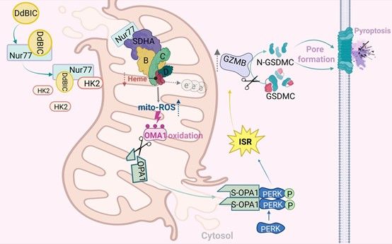 Abstract: Pyroptosis plays a crucial role in physiological and pathological processes. As melanoma cells are resistant to apoptosis but express gasdermin proteins, it is appealing to counter melanoma with the induction of gasdermin-executed pyroptosis. GSDMC, initially cloned from metastatic melanoma cells, has been demonstrated as a potential executioner of pyroptosis. However, no lead compounds that trigger GSDMC-mediated pyroptosis have been reported, which limits the in-depth investigation of GSDMC functions. Here, we discovered a chemical compound, dodecyl 1H-benzo[d]imidazole-5-carboxylate (DdBIC), that targeted the nuclear receptor Nur77 to induce pyroptosis through cleaving GSDMC by granzyme B in melanoma cells. Upon DdBIC binding, Nur77 was translocated to the mitochondria to activate the hemoprotein SDHA to overconsume succinyl-CoA, subsequently disrupting the homeostasis of heme in the SDH complex and resulting in electron leakage to induce mito-ROS production. This mito-ROS signal was sensed by the mitochondrial protease OMA1 via oxidation, which led to downstream OPA1 cleavage and subsequent released into the cytoplasm. Cytosolic OPA1 activated PERK to induce the integrated stress response (ISR), which further activated granzyme B to cleave GSDMC, culminating in the induction of pyroptosis. Together, this study elucidates a signal cascade from Nur77-impaired homeostasis of heme metabolism to PERK-mediated ISR activation, and reveals a novel paradigm, by which granzyme B, rather than caspases, cleaves GSDMC for pyroptotic induction and provides a new strategy for the therapeutic treatment of melanoma by lead compound DdBIC.
