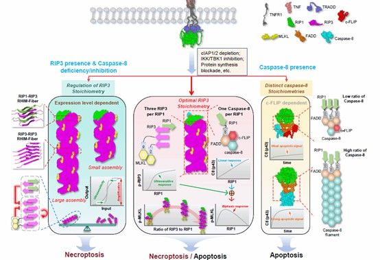 Abstract: Necrosome assembly is essential for necroptosis, a process implicated in neurodegeneration, ischemic injury, and inflammatory diseases. Yet the spatiotemporal rules governing this assembly remain elusive. Leveraging quantitative STORM and mathematical modeling, we define an approximately 3:1 ratio of RIP3 to RIP1 in necrosomes as the optimal stoichiometry for necroptosis, enabling signal amplification and a threshold response. Surprisingly, excessive RIP3 oligomerization attenuates signaling, acting as an intrinsic size control mechanism. RIP3 assembly is dynamically regulated: it is constrained by stimulation and RIP1, promoted by RIP3 itself, and unexpectedly limited by downstream MLKL. A complementary balance between necrosome quantity and RIP3 assembly degree ensures efficient MLKL phosphorylation. In contrast, Caspase-8 assembly is limited by c-FLIP and recruited linearly by RIP1, while its distinct behavior from RIP3 underlies the biphasic necroptotic response to RIP1. These findings uncover the flexible, multi-strategic nature of signalosomes and offer valuable insights for therapeutic and synthetic biology.
