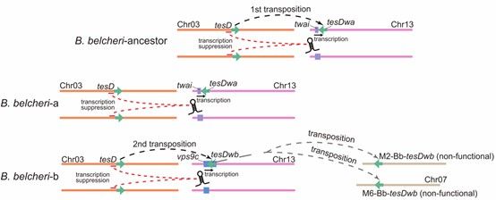 Abstract: Sex determination systems display striking evolutionary flexibility, yet the mechanisms underlying their transitions remain poorly understood. Using newly generated genome assemblies, we investigated the evolving sex-determining system in the amphioxus Branchiostoma belcheri. We identified two female-specific sex-determining regions (SDRs) on chromosome 13, both derived from independent transpositions of the autosomal gene tesD, which shows testis-specific expression in amphioxus species. CRISPR/Cas9 knockout experiments in Branchiostoma floridae confirmed that tesD functions as a male-determination gene, with loss of function producing an all-female phenotype. In B. belcheri, the older SDR (tesDwa) inserted into the coding region of twai, while the younger SDR (tesDwb), flanked by active Zator-1 transposons, inserted into the 3' UTR of vps9c and later translocated to autosomes in ~10% of individuals. Transcriptomic analyses revealed that W-linked tesDwa and tesDwb produce antisense long non-coding RNAs that likely suppress tesD transcription in females, whereas autosomal tesDwb is not expressed and appears non-functional. The insertion sites and co-transcription with host genes suggest promoter hijacking. Together, these findings demonstrate that recurrent transpositions can generate new functional SDRs that coexist with older ones, driving dynamic turnover of sex determination in B. belcheri.