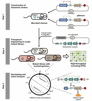 Abstract: Microbial synthesis of chemicals still faces low production due to the complicated metabolic networks, which generally cannot be tackled by rational engineering strategies. In this study, we report on a workflow, biosensor-guided indexing of genome evolution (BRIDGE), to obtain marker-free engineered strains with improved chemical production. We adopt the BRIDGE system to achieve high-level protocatechuic acid (PCA) production in Pseudomonas putida, reaching 4.67 g l-1 in shake flasks. Transcriptomics analysis reveals a synergy between metabolic pathway activation and the secretion system, allowing PCA overproduction. Furthermore, we demonstrate that the engineered P. putida can serve as a platform for de novo synthesis of other chemicals with high titers, achieving 2.97 g l-1cis,cis-muconate in shake flasks. Since the BRIDGE system gives marker-free engineered strains, it would greatly favor downstream industrial applications. Considering the great variety of available biosensors, we envision that our BRIDGE approach will accelerate other microbial synthesis processes with enhanced productivity.