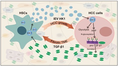 Abstract: Extracellular vesicles play crucial roles in intercellular communication in the tumor microenvironment. Here we demonstrate that in hepatic fibrosis, TGF-β stimulates the palmitoylation of hexokinase 1 (HK1) in hepatic stellate cells (HSCs), which facilitates the secretion of HK1 via large extracellular vesicles in a TSG101-dependent manner. The large extracellular vesicle HK1 is hijacked by hepatocellular carcinoma (HCC) cells, leading to accelerated glycolysis and HCC progression. In HSCs, the nuclear receptor Nur77 transcriptionally activates the expression of depalmitoylase ABHD17B to inhibit HK1 palmitoylation, consequently attenuating HK1 release. However, TGF-β-activated Akt functionally represses Nur77 by inducing Nur77 phosphorylation and degradation. We identify the small molecule PDNPA that binds Nur77 to generate steric hindrance to block Akt targeting, thereby disrupting Akt-mediated Nur77 degradation and preserving Nur77 inhibition of HK1 release. Together, this study demonstrates an overlooked function of HK1 in HCC upon its release from HSCs and highlights PDNPA as a candidate compound for inhibiting HCC progression.