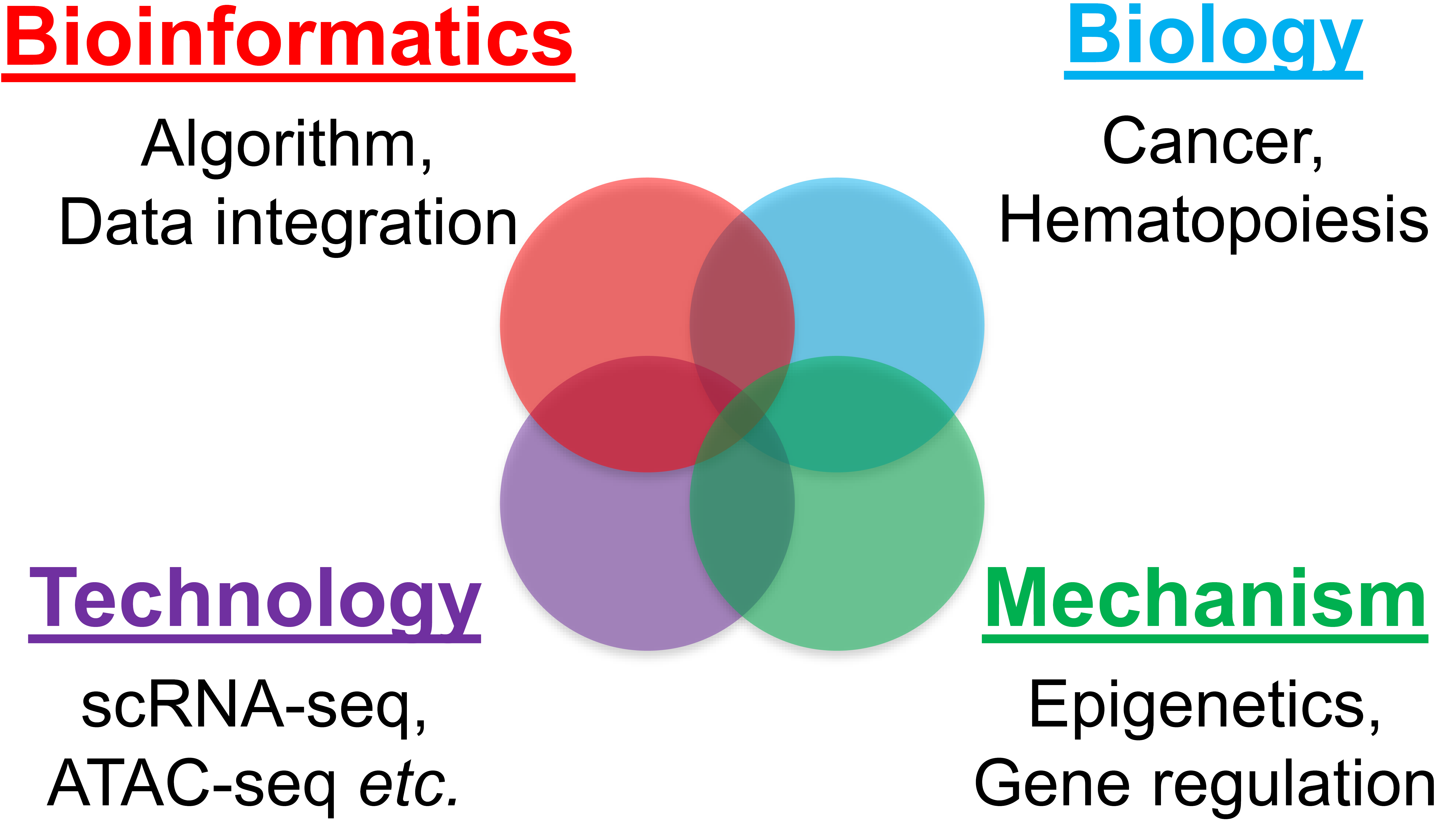 We are interest in understanding the epigenetic regulation mechanisms of development and cancer using computational (dry) and experimental (wet) methods. Our current research includes: (1) developing computational methods for quantification problems for various omics data, such as scRNA-seq, HiC, ATAC-seq and ChIP-seq; (2) integrating genomic, transcriptomic, and epigenomic data to elucidate the gene regulatory networks and for blood development; (3) using single-cell analysis and epigenetic approaches to investigate the cellular heterogeneity and gene regulatory mechanisms associated with cancer progression and treatment response, which helps to identify potential drug targets.